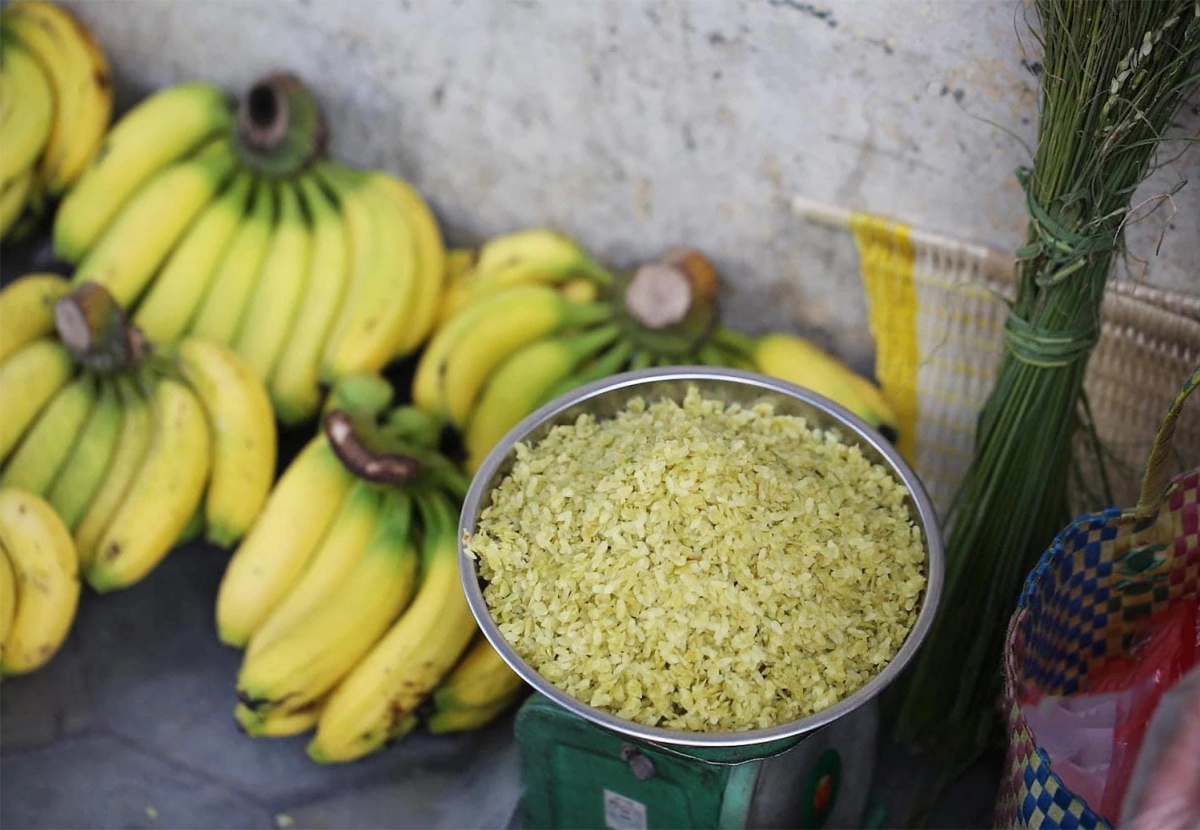 Cốm là thức quà tượng trưng cho Hà Nội mùa thu. Cốm được làm từ lúa nếp non, thu hoạch khi hạt lúa còn mềm, trải qua các công đoạn chính là rang, giã và sàng sảy để tách vỏ và tạp chất. Cốm sau đó được gói trong lá sen hoặc lá chuối để giữ độ mềm và hương thơm tự nhiên. Cốm ăn ngon và đúng điệu là với chuối tiêu chín. Ngoài ra, mùa thu Hà Nội không thể thiếu sấu chín dầm muối ớt, hồng chín đỏ hoặc hồng ngâm. Ảnh: Vũ Minh Quân