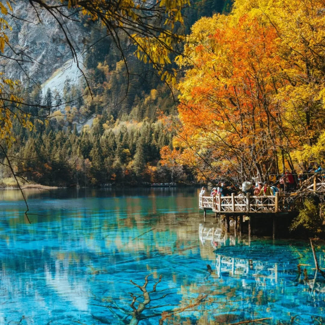 Được mệnh danh là “thiên đường hạ giới”, Cửu Trại Câu mùa thu khiến người ta choáng ngợp bởi sự kết hợp hoàn hảo giữa hồ nước xanh ngọc, rừng phong đỏ và núi non hùng vĩ. Đi dọc theo lối gỗ quanh hồ Ngũ Hoa, bạn sẽ thấy nước trong đến mức nhìn rõ từng nhánh cây chìm dưới đáy. Đặc biệt, khi nắng chiếu qua rừng lá vàng đỏ, toàn bộ khung cảnh như biến thành bức tranh thủy mặc sống động. Đây là điểm đến mà chỉ cần một lần ghé thăm, bạn sẽ mang theo ký ức cả đời.