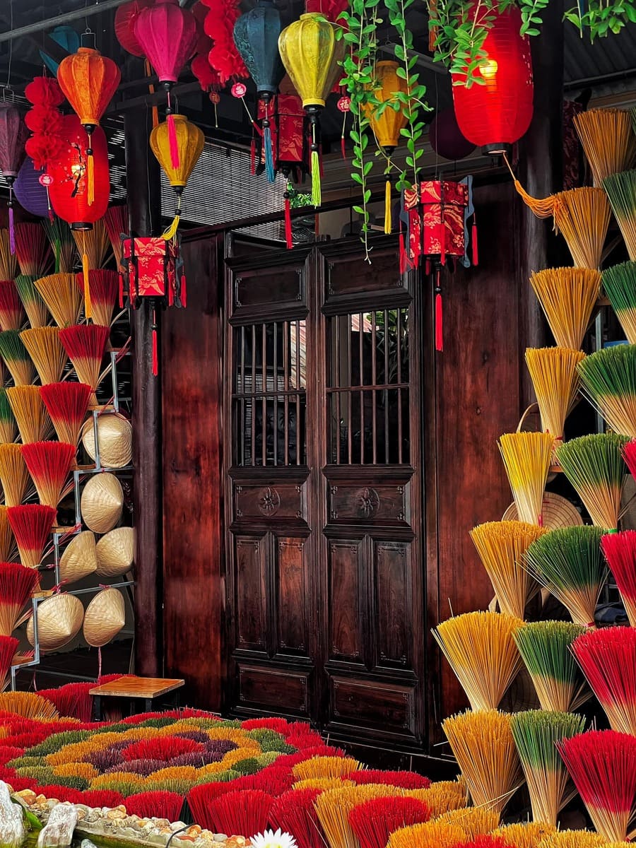 Trong hành trình du lịch làng hương Thuỷ Xuân, du khách sẽ được đắm mình trong không gian mộc mạc, cổ kính đậm chất cố đô. Đây không chỉ là nơi lưu giữ nghề làm hương truyền thống lâu đời, mà còn là điểm đến lý tưởng cho những ai yêu thích trải nghiệm văn hóa Huế. Bên cạnh những bó hương rực rỡ sắc màu – biểu tượng đặc trưng của làng nghề truyền thống, bạn còn có thể tìm thấy nhiều quà lưu niệm Huế như nón bài thơ, quạt gỗ khắc tay, túi vải thổ cẩm hay các bức tranh nghệ thuật dân gian. Những món quà tinh tế này là lựa chọn hoàn hảo để mang về làm kỷ niệm hoặc tặng người thân sau chuyến du lịch trải nghiệm tại Huế.